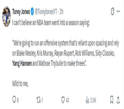 NBA記者特雷-瓊斯,我簡(jiǎn)直不理解有NBA球隊(duì)會(huì)說(shuō)依靠韋斯利、克里斯穆雷、羅威、西索科、楊瀚森、塞布爾這樣的陣容來(lái)投三分球,這完全是瘋狂的說(shuō)法。