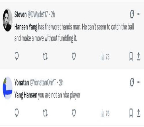 美球迷:楊瀚森是隊(duì)內(nèi)傳球能力最差的,他就連接球并順利傳球都困難,很多次都是失誤;楊瀚森就不是一個(gè)NBA級(jí)別的球員。