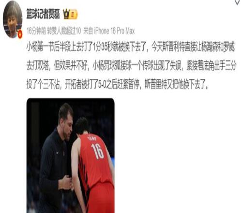 賈磊:楊瀚森第一節(jié)后半段打1分35秒就被換下,他與羅威的雙塔效果并不好,罰球線傳球失誤,底角三分三不沾,開(kāi)拓者被打5-0楊瀚森就被換下了。
